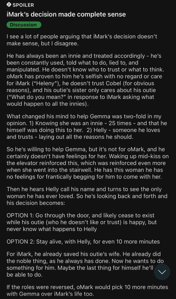 The thing about Severance is that it makes you think a lot about one’s autonomy. Helly R. not wanting to hear about iMark’s sexperience with Helena, she wanted her own. The way Helly expressed her disproval and feelings of betrayal for her outtie ‘taking over’ her time at the severed floor.